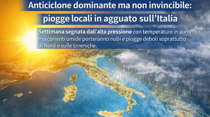 Settimana segnata dall’alta pressione con temperature in aumento, ma correnti umide porteranno nubi e piogge deboli soprattutto al Nord e sulle tirreniche.