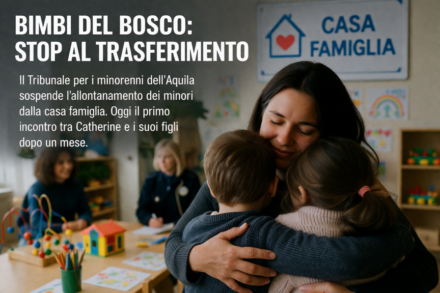Svolta nella vicenda dei cosiddetti “bimbi del bosco”: il Tribunale per i minorenni dell’Aquila ha disposto la sospensione del trasferimento dei minori dalla casa famiglia in cui vivono ormai da oltre quattro mesi, rivedendo la precedente ordinanza del 6 marzo.