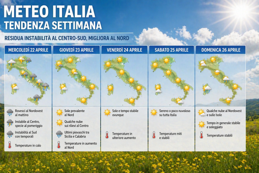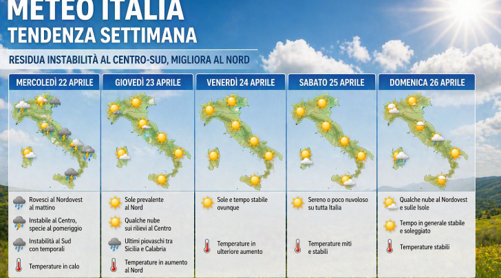 Per giovedì 23 aprile si consolida il miglioramento: al Nord il rinforzo della pressione atmosferica garantirà una giornata prevalentemente soleggiata, con poche nubi lungo i rilievi. Situazione analoga al Centro, dove prevarranno condizioni stabili, mentre al Sud si registreranno gli ultimi fenomeni tra Sicilia e Calabria, in rapido esaurimento. Le temperature torneranno a salire al Nord, mentre resteranno più contenute al Sud.