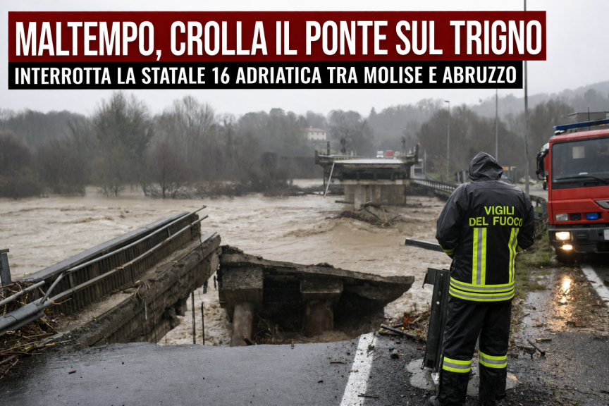 Il maltempo persistente che da oltre tre giorni interessa il Centro-Sud Italia continua a produrre effetti rilevanti sulla viabilità, sulle infrastrutture e sulla sicurezza dei territori. La situazione più critica si registra lungo il versante adriatico, dove il territorio appare di fatto diviso in due. Il cedimento del ponte sul fiume Trigno, lungo la statale 16 Adriatica, ha interrotto i collegamenti tra Abruzzo e Molise, aggravando un quadro già compromesso dalle esondazioni e dall’ingrossamento dei corsi d’acqua.