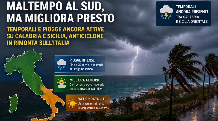 Maltempo ancora attivo su alcune regioni meridionali con rovesci e temporali intensi, mentre al Nord e Centro si consolida un graduale miglioramento