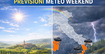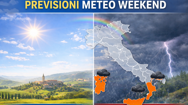 Tra alta pressione e depressione occidentale, il fine settimana vedrà condizioni opposte tra Penisola e Isole Maggiori, con fenomeni intermittenti al Sud e clima più stabile altrove.